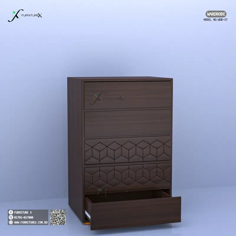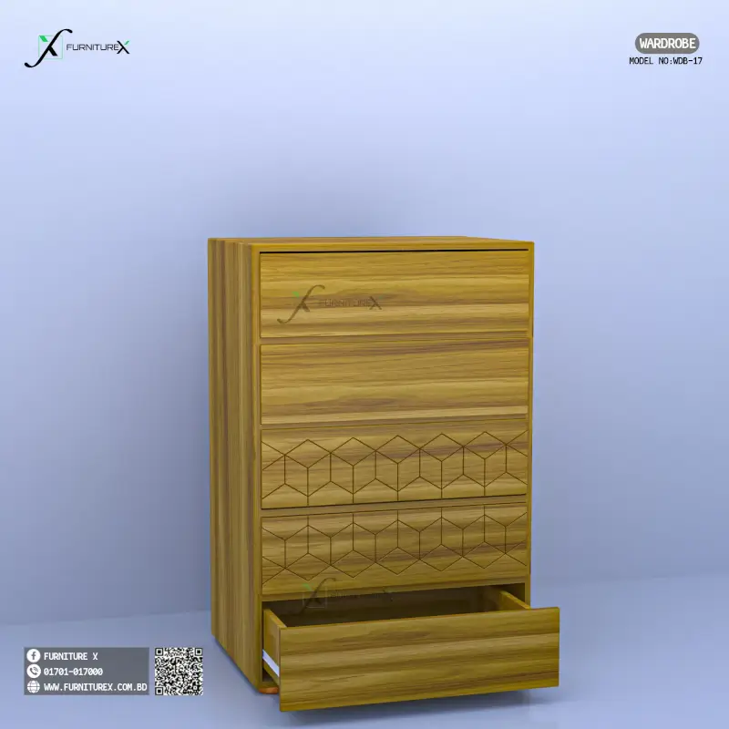 The Astro – Wardrobe BW17 stands out with its clean lines, five spacious drawers, and unique geometric drawer fronts that add visual interest. Furthermore, the orange‑tinted legs elevate the piece, creating a light‑filled appearance. Additionally, its price of BDT 29,600 delivers excellent value compared to other wooden board wardrobe price ranges in Bangladesh.